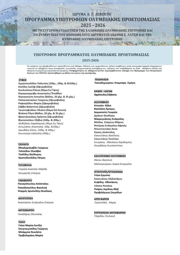 Στο Πρόγραμμα Υποτροφιών Ολυμπιακής Προετοιμασίας 2025 – 2026 του Ιδρύματος Α. Γ. Λεβέντη συμπεριλήφθηκαν 14 Κύπριοι αθλητές, με τους περισσότερους να προέρχονται από τον στίβο και τη σκοποβολή. Συγκεκριμένα, εντάχθηκαν 5 αθλητές στίβου, 3 αθλητές σκοποβολής, 2 αθλητές τζούντο, 1 αθλήτρια κολύμβησης, 2 αθλητές ιστιοπλοΐας και 1 αθλήτρια ρυθμικής γυμναστικής.