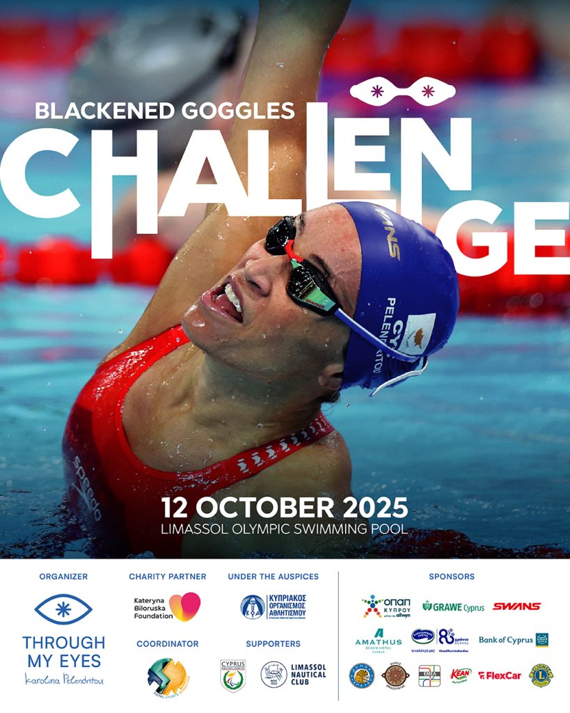 Για τρίτη συνεχόμενη χρονιά διοργανώνεται την Κυριακή, 12 Οκτωβρίου (16:00 – 19:00) η Φιλανθρωπική Ημερίδα Κολύμβησης «Blackened Goggles Challenge». Η Ημερίδα θα διεξαχθεί και φέτος στο Ολυμπιακό Κολυμβητήριο Λεμεσού, το οποίο ανοίγει ξανά μετά από εργασίες συντήρησης. Διοργανωτής είναι ο Μη Κερδοσκοπικός Οργανισμός «Through My Eyes by Karolina Pelendritou», τον οποίον συνέστησε προσφάτως η τρις Χρυσή Παραολυμπιονίκης μας Καρολίνα Πελενδρίτου.