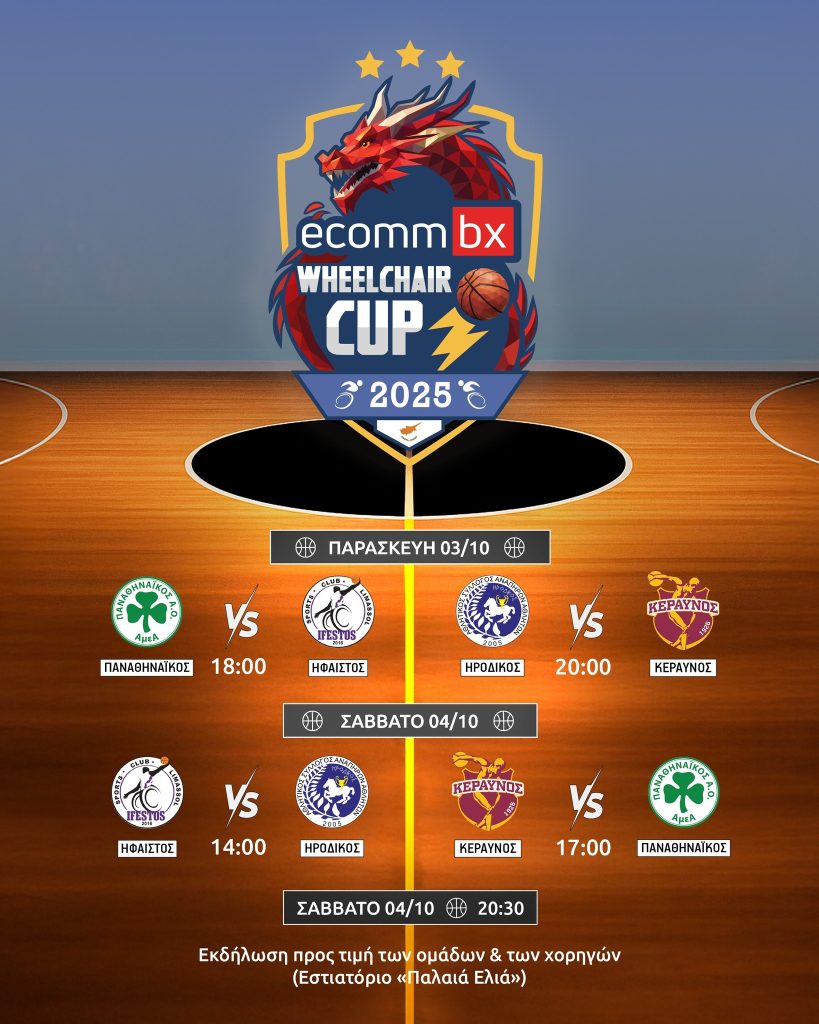 Με τη συμμετοχή τις νταμπλούχου Κύπρου στο τροχοκάθισμα, Κεραυνού, του κυπελλούχου και φιναλίστ για το πρωτάθλημα, Παναθηναϊκού, καθώς και με τους Ήφαιστο και Ηρόδικο θα διεξαχθεί το διήμερα 3-4 Οκτωβρίου το πρώτο ECOMMBX WHEELCHAIR CUP.