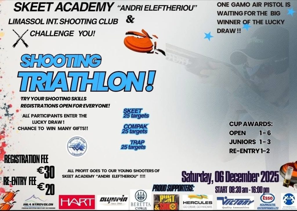 Η Ακαδημία Σκοποβολής Σκητ «Άντρη Ελευθερίου», διοργανώνει, υπό την αιγίδα της ΣΚΟΛΕΜ (Σκοπευτικής Οργάνωσης Λεμεσού) και με την υποστήριξη του Διεθνούς Σκοπευτηρίου Λεμεσού και της ΣΚΟΚ, σκοπευτικό αγώνα Σκητ, Τραπ και Compak το Σάββατο 6 Δεκεμβρίου 2025, από τις 08:30 μέχρι τις 16:00, στο Διεθνές Σκοπευτήριο Λεμεσού. Ο αγώνας περιλαμβάνει Σκοπευτικό Τρίαθλο με 25 δίσκους ανά αγώνισμα, προσφέροντας 75 δίσκους συνολικά σε μία ημέρα. Στόχος είναι η ανάδειξη των δεξιοτήτων των συμμετεχόντων και η προώθηση της σκοποβολής στην Κύπρο. Στην εκδήλωση θα συμμετάσχουν γνωστές προσωπικότητες από τον αθλητικό και πολιτικό χώρο και θα πραγματοποιηθούν απονομές για τις κατηγορίες: