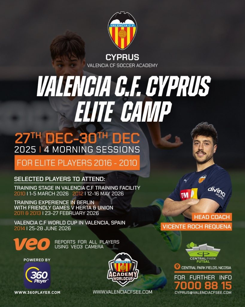 Το 4ο Valencia C.F. Elite Camp θα πραγματοποιηθεί από τις 27 έως τις 30 Δεκεμβρίου 2025 στα γήπεδα Central Park Fields στην Αγγλική Σχολή, στη Λευκωσία.